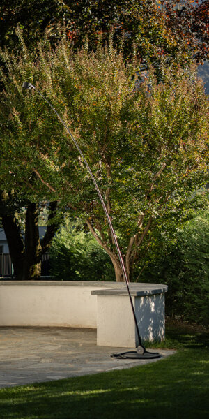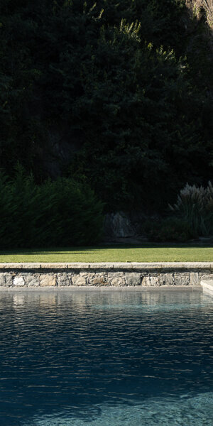 La ridistribuzione degli spazi interni ha rappresentato il fulcro del progetto. L'intero piano terra è stato trasformato in un'unica zona giorno fluida, capace di dialogare con entrambi i giardini, quello a nord, dominato dalla presenza scenografica di una roccia affiorante, e quello a sud, attraverso vetrate a tutta altezza che azzerano il confine tra interno ed esterno. Il camino centrale preesistente è stato reinterpretato come elemento connettivo: sfondato per mettere in comunicazione le diverse aree del living, funge da cardine visivo e funzionale. Un piccolo salottino sopraelevato di un gradino introduce una gerarchia spaziale discreta ma percepibile, recuperando una tecnica compositiva tipica dell'architettura residenziale di qualità. Al piano superiore, il bow window della camera da letto padronale, aperto su due lati e a diretto contatto visivo con la chioma degli alberi circostanti, trasforma il paesaggio alpino in presenza domestica quotidiana.