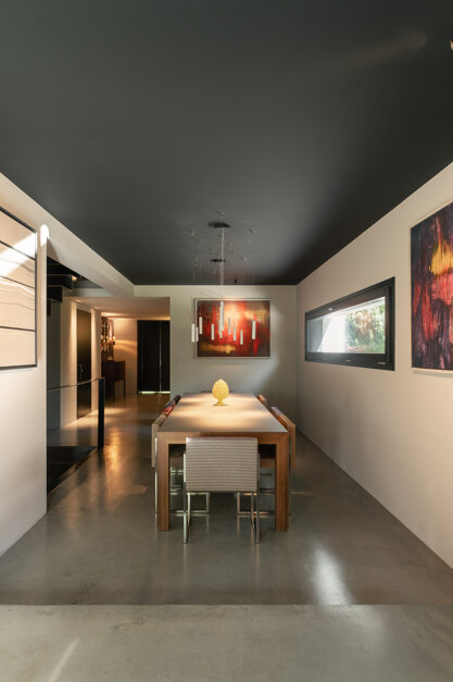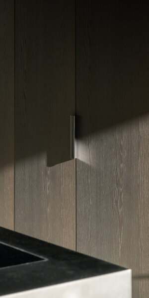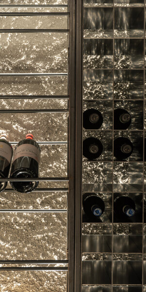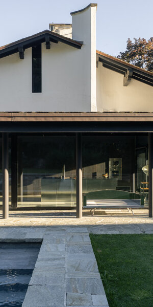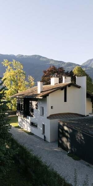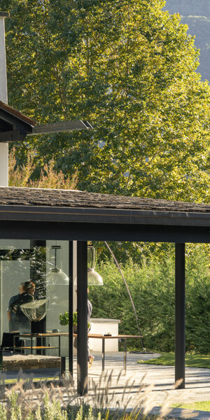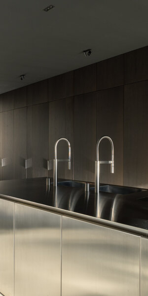 Il nuovo corpo di fabbrica destinato alla cucina si integra nella composizione senza fratture percettive. Un bancone in acciaio inox ne diventa l'elemento protagonista, mentre un'armadiatura a tutta altezza in legno separa il nuovo volume dal corpo storico, garantendo continuità materica. Per non compromettere il rapporto visivo tra la casa e lo sfondo montano, è stato realizzato un box interrato collegato all'abitazione tramite un tunnel di ventiquattro metri, lungo il quale trovano spazio una cantina per vini e una taverna.